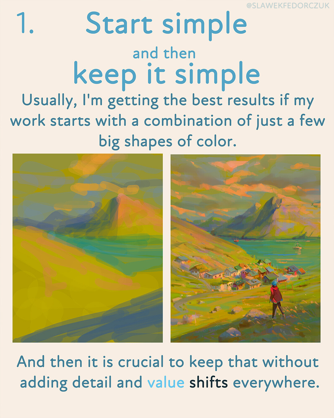 - 开始创作时,先用几个基本的大色块建立画面结构