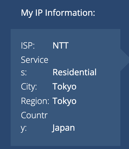 City: Tokyo, Region: Tokyo, Country: Japan 表示連接的IP被定位在日本東京。
